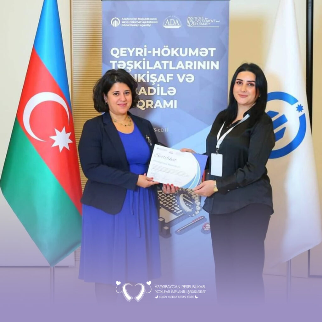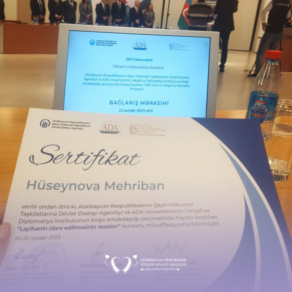 Azərbaycan Respublikasının Qeyri-Hökumət Təşkilatlarına Dövlət Dəstəyi Agentliyi və ADA Universitetinin təşkilatçılığı ilə “Layihənin idarə edilməsinin əsasları” adlı təlimin son günündə təşkilatımızda iştirak etmişdir. Qeyd etmək istərdik ki təlim çox səmərəli və faydalı keçmiş, bir çox nüanslarda bizim təşkilatımızda daxil olmaqla digər bütün təşkilatlarda bir çox mövzuda maariflənmişdir. Bu gözəl dəvətə və diqqətə görə bütün əməyi keçən hərkəsə təşkilatımız adından öz xüsusi təşəkkürlərimizi bildiririk.